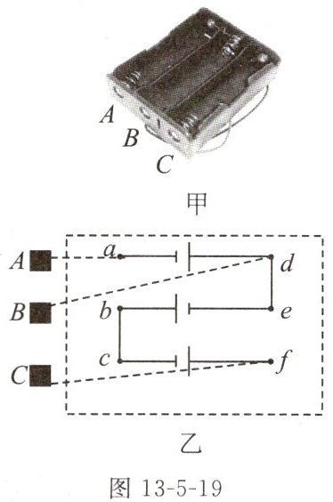 10. [科学思维](2023苏州姑苏区月考)如图13-5-19甲所示的电池盒,盒外有三个接线柱A、B、C;盒内有三个1.5V电池的插槽,六个接触点a、b、c、d、e、f。现将三节干电池(用符号表示)连接起来组成一个电源,如图乙所示(图中虚线为已连接好的导线),选接盒外不同接线柱,可从该电池盒获得不同的输出电压,则()