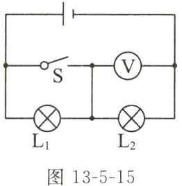 6. (2022泰州期中)在如图13-5-15所示的电路中,当开关S闭合后,电压表示数为6.3V;当开关S断开时,电压表示数为2.5V。则开关S断开时,灯$L_1$和$L_2$两端的电压分别为 ()