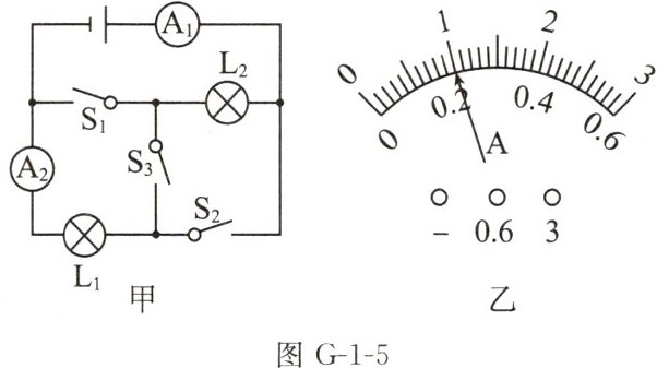 6. (2024 无锡期中)如图 G-1-5 甲所示,当开关$S_{1}$、$S_{2}$闭合,$S_{3}$断开时,灯泡$L_{1}$、$L_{2}$均能正常发光,两个电流表的指针位置均如图乙所示,则通过灯$L_{1}$的电流是______A,通过灯$L_{2}$的电流是______A。若同时闭合开关$S_{1}$、$S_{2}和S_{3}$______(选填“会”或“不会”)烧坏电源。