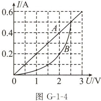5. (2024 无锡期中)有两个电路元件 A 和 B,流过元件的电流与其两端电压的关系如图 G-1-4 所示。若它们串联在某一电路中时,A 中电流为 0.1 A,则它们并联在同一电路中时,A 中电流为 ()