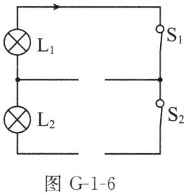 7. (2023 常州模拟)在如图 G-1-6 所示电路中,根据标出的电流方向把电池和电流表的符号分别填入电路中,使开关$S_{1}$、$S_{2}$闭合时,灯泡$L_{1}和L_{2}$都能发光。由此可判断,灯泡$L_{1}和L_{2}$是______联的,电流表测量的是通过______的电流。