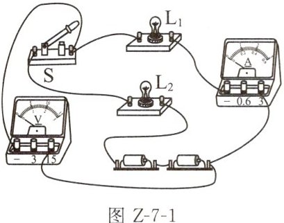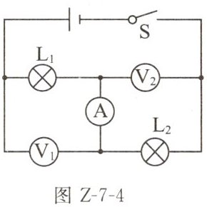 7. 如图 Z-7-9 所示电路,电源电压为 $ 5 \mathrm{~V} $。闭合开关 $ S_{1} $、断开 $ S_{2} $ 时,电压表的示数是______V;当同时闭合开关 $ S_{1} $、$ S_{2} $ 时,电流表的示数是 $ 0.3 \mathrm{~A} $,电压表的示数为______V,通过 $ L_{1} $ 的电流是______A,$ L_{2} $ 两端的电压是______V。