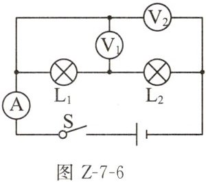 5. 如图 Z-7-6 所示电路中,灯泡 $ L_{1} $ 和 $ L_{2} $ 是______(选填“串联”或“并联”)连接的,开关 S 闭合时,电流表的示数是 $ 0.2 \mathrm{~A} $,电压表 $ V_{1} $、$ V_{2} $ 的示数分别为 $ 1.2 \mathrm{~V} $ 和 $ 2.8 \mathrm{~V} $,则通过 $ L_{1} $ 的电流是______A,$ L_{2} $ 两端的电压是______V。