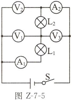 4. (2023 南京模拟)如图 Z-7-5 所示电路,当开关 S 闭合时,电压表 $ V_{1} $、$ V_{2} $、$ V_{3} $ 的示数分别为 $ U_{1} $、$ U_{2} $、$ U_{3} $,电流表 $ A_{1} $、$ A_{2} $ 的示数分别为 $ I_{1} $、$ I_{2} $(所有电表的读数均不为零),那么下列关系式正确的是 ()