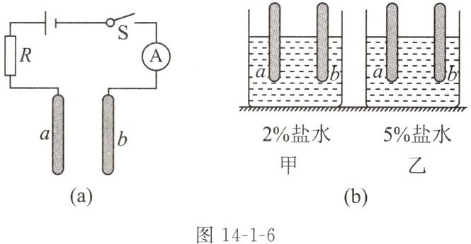12. [科学思维]某物理兴趣小组学习了导体电阻的知识后,对食盐水溶液的导电性能与什么因素有关进行了探究,他们设计了如图 14-1-6(a)所示的装置,将电路中的 a、b 两金属片分别插入图(b)甲、乙溶液中所示的位置进行探究: