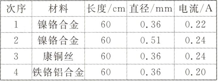 实验中使用的 4 根合金丝,其规格、材料如下表所示。
