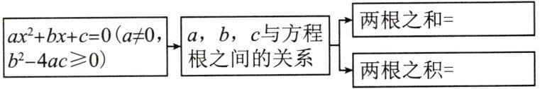 $ a x ^ { 2 } + b x + c = 0 ( a \neq 0 , b ^ { 2 } - 4 a c \geq 0 ) $ → $ a , b , c $ 与方程根之间的关系 → 两根之和= ____,两根之积=