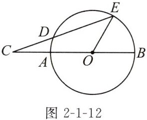 例3 (教材典题)如图2-1-12,AB是$\odot O$的直径,C是BA延长线上一点,点D在$\odot O$上,且$CD= OA$,CD的延长线交$\odot O$于点E.若$∠C= 20^{\circ }$,求$∠BOE$的度数.