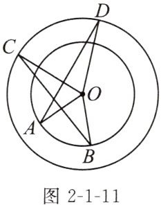 例2 (教材典题)如图2-1-11,点A,B和点C,D分别在以点O为圆心的两个同心圆上,且$∠AOB= ∠COD$.$∠C与∠D$相等吗? 为什么?