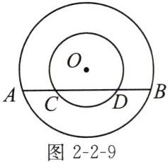 例1(教材典题)如图2-2-9,在以点$O$为圆心的两个同心圆中,大圆的弦$AB交小圆于点C$,$D$。$AC与BD$相等吗?为什么?