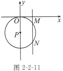 如图2-2-11,点$P在y$轴上,过坐标原点的$\odot P与平行于y轴的直线交于M$,$N$两点。若点$M的坐标是(2,-1)$,则点$N$的坐标为