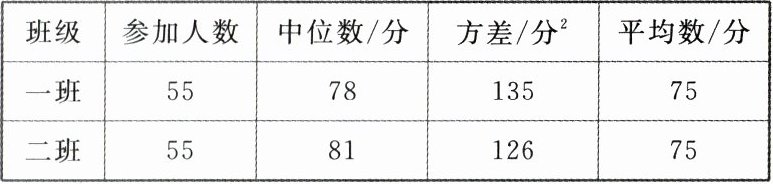 张老师根据上表对本次考试得出如下结论:①一、二两班学生的平均水平相同;②二班的优秀人数多于一班的优秀人数(成绩≥80分为优秀);③一班成绩波动情况比二班成绩波动大.上述结论正确的是 (