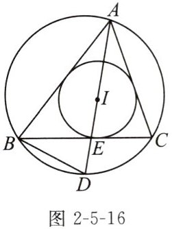 例2 如图2-5-16,在△ABC中,点I是△ABC的内心,∠BAC的平分线与△ABC的外接圆相交于点D,与BC相交于点E,连接DB. 求证:DI= DB.
