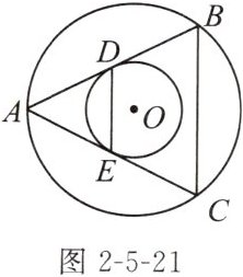 拓展 如图2-5-21,在以点O为圆心的两个同心圆中,大圆的弦AB,AC分别与小圆相切于点D,E,连接DE,BC,那么DE与BC有怎样的关系?为什么?