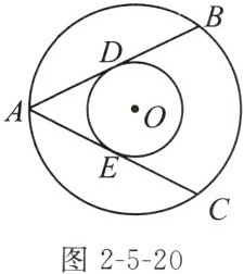 例1(教材典题)如图2-5-20,在以点O为圆心的两个同心圆中,大圆的弦AB,AC分别与小圆相切于点D,E。AB与AC相等吗?为什么?