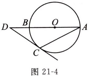 4. 如图 21 - 4,AB 是$\odot O$的直径,点 D 在 AB 的延长线上,DC 切$\odot O$于点 C,若$∠D = 34^{\circ}$,则$∠A$的度数为______
