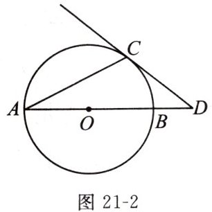2. 如图 21 - 2,已知$\odot O$的直径 AB 与弦 AC 的夹角为$25^{\circ}$,过点 C 作$\odot O$的切线交 AB 的延长线于点 D,则$∠D$等于 (