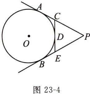 4. 如图23-4,PA,PB,CE分别切$\odot O$于点A,B,D,若$\triangle PCE$的周长为18 cm,求PA的长.