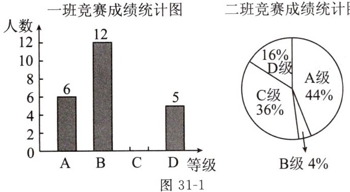 为了巩固某市创建“省级卫生城市”成果,某校组织了一次环保知识竞赛,每班选25名同学参加比赛,成绩分为A,B,C,D四个等级,对应的分数依次为100分、90分、80分、70分.学校将某年级的一班和二班的成绩整理并绘制成如图31-1所示的统计图.