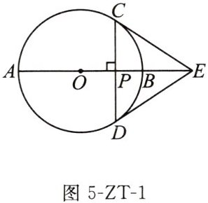 1. 如图5-ZT-1,在$\odot O$中,AB是直径,CD是弦,$AB⊥CD$,垂足为P,过点D作$\odot O$的切线与AB的延长线交于点E,连接CE.求证:CE为$\odot O$的切线.