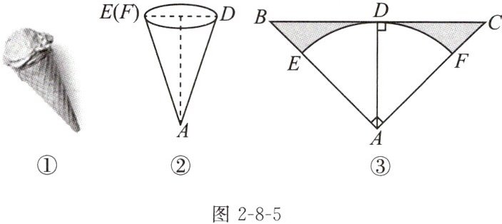 7. 图 2-8-5①中的某种冰激凌的外包装可以视为圆锥(如图②),制作这种外包装需要用如图③所示的等腰三角形材料,其中 $AB = AC$,$AD⊥BC$ 于点 $D$,将扇形 $AEF$ 围成圆锥时,$AE$,$AF$ 恰好重合,已知这种加工材料的顶角 $∠BAC = 90^{\circ}$.