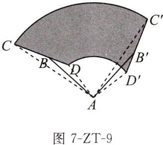 9. 当汽车在雨天行驶时,司机为了看清楚道路,要启动前方挡风玻璃上的雨刷.图7-ZT-9是某汽车的一个雨刷的转动示意图,雨刷杆AB与雨刷CD在B处固定连接(不能转动),当杆AB绕点A顺时针转动$90^{\circ }$时,雨刷CD扫过的面积是图中阴影部分的面积,现量得$CD= 80cm,∠DBA= 20^{\circ },AC= 115cm,DA= 35cm$,试从以上信息中选择所需要的数据,求出雨刷CD扫过的面积.(结果保留π)