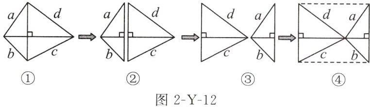 (2)如图 2-Y-12①是一个对角线互相垂直的四边形,四条边长 a,b,c,d 之间存在某种数量关系.小昕按图中所示步骤进行操作,并将最终图形抽象成图 2-Y-13.请你结合整个变化过程,直接写出图 2-Y-13 中以矩形内一