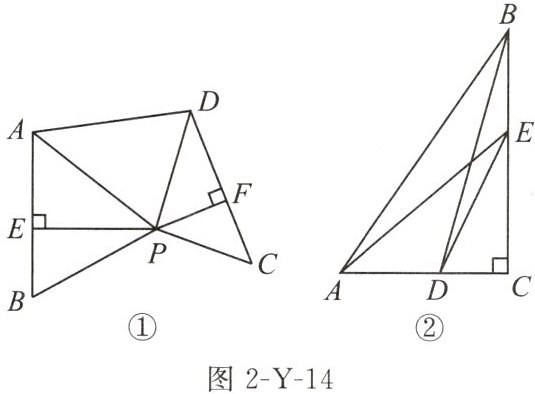 (3)如图 2-Y-14①,在图 2-Y-12 中“④”的基础上,小昕将$△PDC$绕点 P 逆时针旋转,他发现旋转过程中$∠DAP$存在最大值.若$PE= 8,PF= 5$,当$∠DAP$最大时,求 AD 的长;