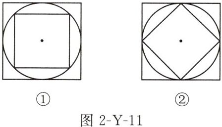 (1)如图 2-Y-11①,圆与大正方形的各边都相切,小正方形是圆的内接正方形,那么大正方形面积是小正方形面积的几倍? 小昕将小正方形绕圆心旋转$45^{\circ }$(如图②),这时候就容易发现大正方形面积是小正方形面积的______倍.由此可见,图形变化是解决问题的有效策略.