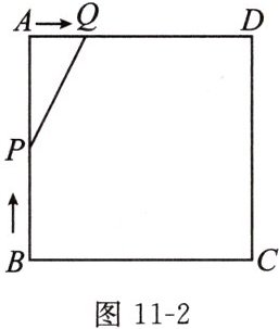 2. 如图 11 - 2,正方形$ABCD的边长为4\mathrm{cm}$,动点$Q从点A出发向终点D$运动,速度为$1\mathrm{cm}/\mathrm{s}$;同时动点$P从点B出发向终点A$运动,速度为$2\mathrm{cm}/\mathrm{s}$,运动时间为$t\mathrm{s}$,当其中一个点到达终点时,另一个点立即停止运动,连接$QP$.