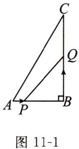 1. 如图 11 - 1,在$\triangle ABC$中,$∠B = 90^{\circ},AB = 6\mathrm{cm},BC = 10\mathrm{cm}$,点$P从点A开始沿AB边向点B以1\mathrm{cm}/\mathrm{s}$的速度移动,点$Q从点B开始沿BC边向点C以4\mathrm{cm}/\mathrm{s}$的速度移动. 点$Q到达点C$后,点$P,Q$同时停止移动. 设点$P,Q分别从点A,B$同时出发,经过多少秒后,$\triangle PBQ的面积是10\mathrm{cm}^{2}$?