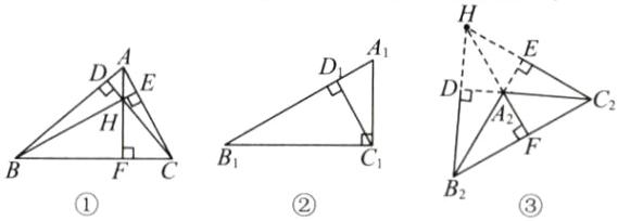 画出钝角三角形$A_2B_2C_2$的3条高,如图③,这3条高所在的直线相交于一点,这点在三角形的外部.