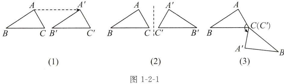 如图1-2-1,△ABC分别通过平移、轴对称、旋转得到△A'B'C'。变换前后的两个三角形有什么关系?