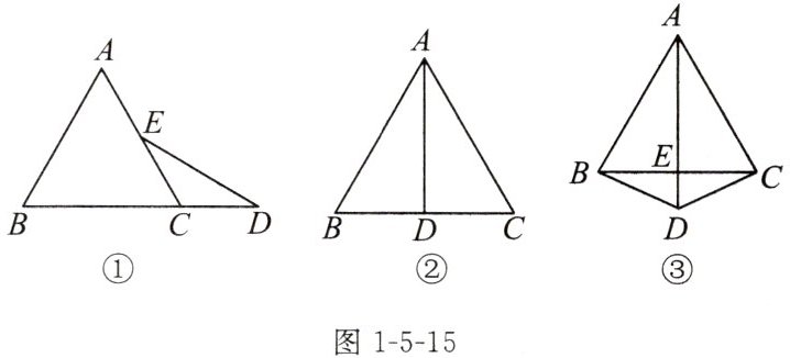 练习1 (1)如图1-5-15①,△ABC是等边三角形,点D在线段BC的延长线上,且CD= CE,则∠D=