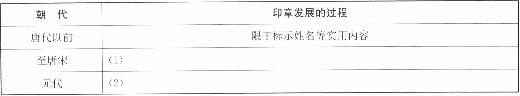 [材料一] 印章,如同文房四宝一般,既是工具,亦是艺术品。它是古代文人书斋生活不可缺少的一部分。印章自古就有,且样式繁多,但一直以来限于标示姓名等实用内容。至唐宋,开始被应用于书画鉴藏,出现了完全脱离实用而纯粹表达文学志趣、哲理心得的闲章,这使印章的艺术性大为增强。至元代,文人用印已经非常普遍,文人印真正走向成熟。元代成为印章艺术发展的一个重要时期,为明清印章流派的崛起、篆刻学的发展奠定了基础。
