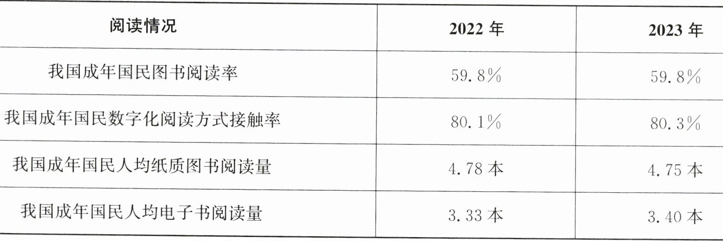 [材料二]2024 年 4 月 23 日,第三届全民阅读大会在云南昆明召开,主论坛上发布了《第二十一次全国国民阅读调查报告》。统计数据显示: