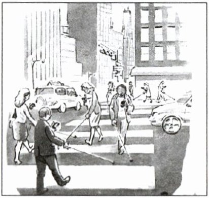 25. 示例:在车水马龙的大街上,人们都拄着拐杖探路,目不转睛地看着手机,全然不顾来往车辆。