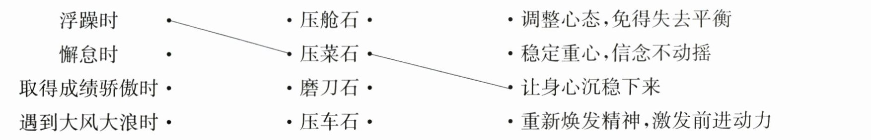 ⑤ 这些小石头垒墙盖屋当不了大用处,却被人们用在生产生活的小环节上,用得恰如其分,也给了我们的人生一点启示。浮躁时,用“压菜石”压住,让身心沉稳下来;懈怠时,用“磨刀石”及时磨砺,重新焕发精神,激发前进的动力;取得成绩骄傲时,用“压车石”调整心态,免得失去平衡翻车;遇到大风大浪时,用“压舱石”稳定重心,让信念不发生动摇。