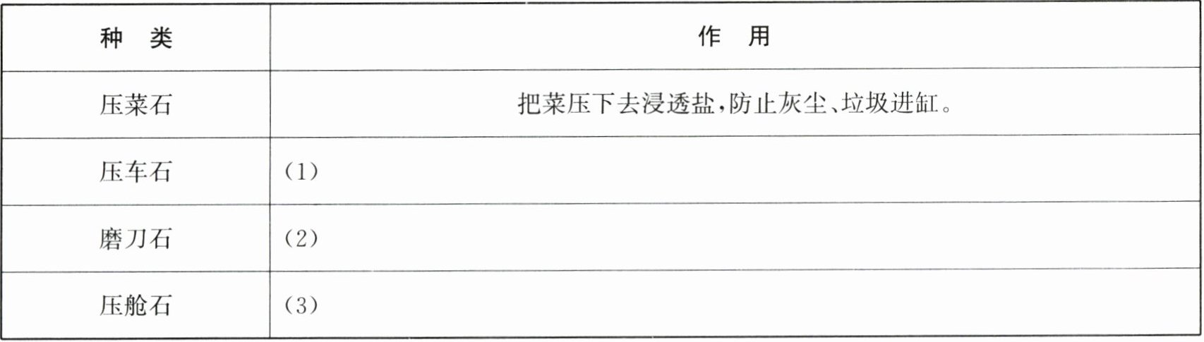 | 压菜石 | 把菜压下去浸透盐,防止灰尘、垃圾进缸。 |