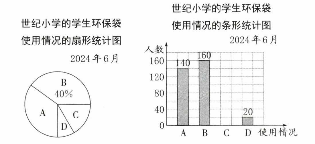 6. 明明对世纪小学的学生使用环保袋的情况进行了随机调查,调查分为四个等级:A. 一直使用;B. 经常使用;C. 较少使用;D. 从不使用。最后统计结果绘制成下面两幅不完整的统计图。