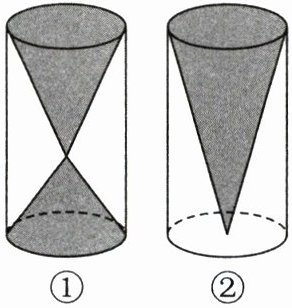 相等 理由:假设圆柱底面积为S,高为h,图①中两个圆锥的高分别是$h_1$和$h_2$。图①中两个圆锥的体积之和是$\frac{1}{3}Sh_1+\frac{1}{3}Sh_2=\frac{1}{3}S(h_1+h_2)=\frac{1}{3}Sh$,图②中圆锥的体积是$\frac{1}{3}Sh$,所以图①中两个圆锥的体积之和与图②中圆锥的体积相等。