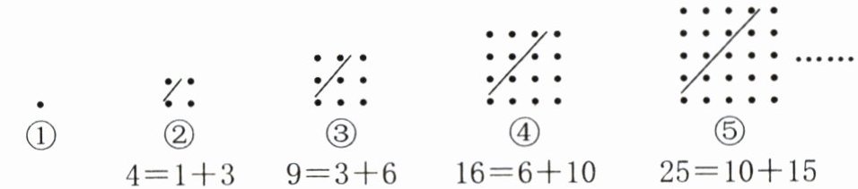 (3)如果用一条斜线把“正方形数”分成了两部分(如图),那么可以发现任何一个大于 1 的“正方形数”都可以看作两个相邻的“三角形数”之和。以此类推,第⑤幅图为( )= ( )+( )。