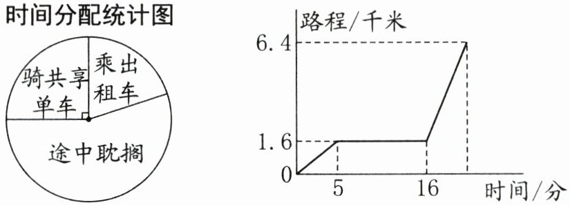 30. 李老师从家出发,骑共享单车去学校。路上遇到朋友停下聊天耽误了一些时间,他估计不能准时到学校,于是改乘出租车。下面两幅统计图分别记录了李老师从家去学校的时间分配和行程情况。出租车行驶的平均速度是多少千米/分?(7 分)