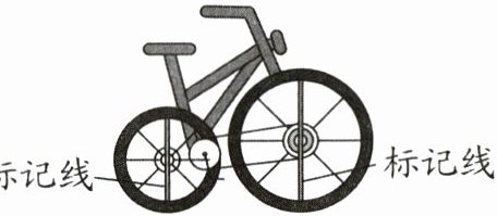 2.5 5.5 解析:前轮标记线两端点间的圆弧长恰好是半个圆周,即70×π÷2=35π(厘米),后轮标记线两端点间的圆弧长也是半个圆周,即50×π÷2=25π(厘米),它们的比是35π:25π=7:5,求两根标记线同时与地面垂直的问题,可以转化成求7 和5的公倍数问题,它们的最小公倍数是35,35÷7=5,所以前轮转5个半圈,即转了2.5圈。此时,自行车骑行了3.14×70×2.5=549.5(厘米),549.5厘米≈5.5米。