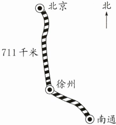 25. 如图,北京到徐州的图上距离是 3 厘米,徐州到南通的图上距离是 2 厘米。某列火车上午 8:30 从南通开出,2.4 小时后行到徐州,如果不考虑停靠站时间,那么这列火车什么时候能到达北京?(5 分)