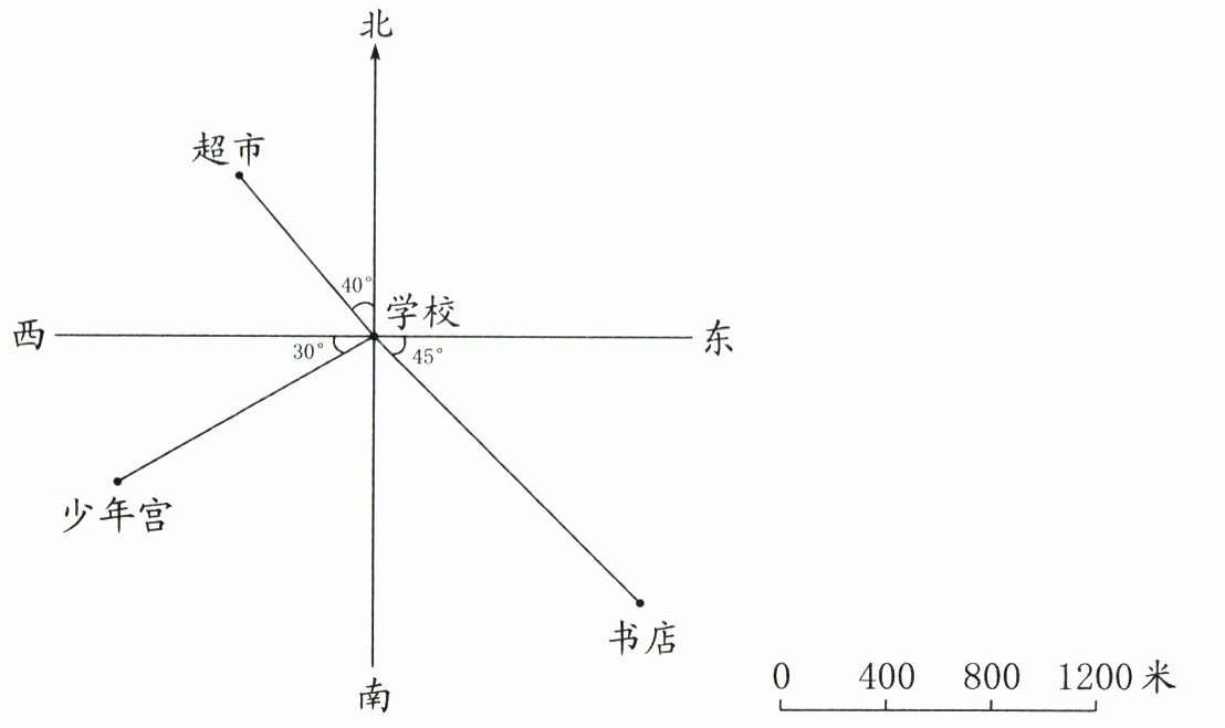 30. (1)下图中,以学校为观测点,超市在( )偏( )( )°方向上;以超市为观测点,学校在( )偏( )( )°方向上。(2 分)