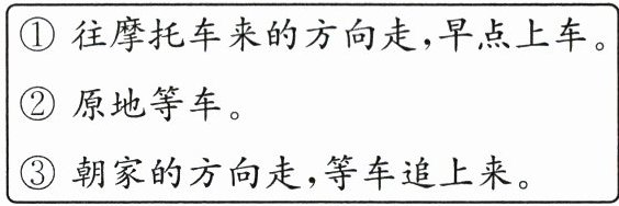 (1)答案不唯一,如我选择方案②理由:因为步行速度与车速相差太大,步行走的路程可以忽略,避免自己太累,选择在原地等待。(2)(3 + 2)÷30 = $\frac{1}{6}$(时)