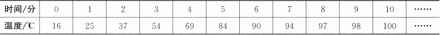 (2)16 (3)先快后慢(4)100 解析:由于第 10 分钟时水温是$100^{\circ}C$,水的沸点是$100^{\circ}C$,所以第 11 分钟时水温不会有变化,即还是$100^{\circ}C$。