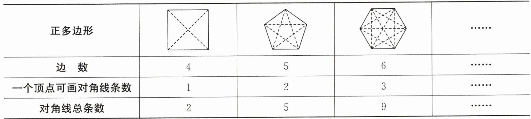 |正多边形|边数|一个顶点可画对角线条数|对角线总条数|