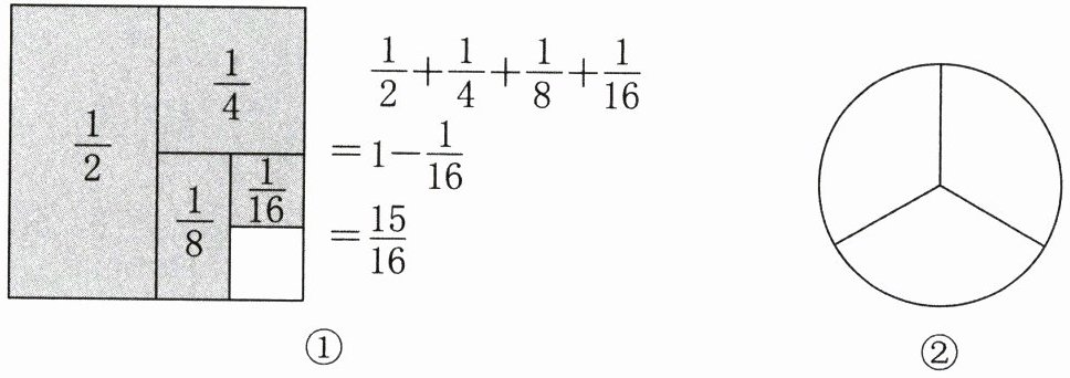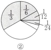 25. 我国著名数学家华罗庚先生曾说:“数缺形时少直观,形少数时难入微。”学习数学时把数与形联系起来思考,往往会有意想不到的作用。如计算$\frac{1}{2}+\frac{1}{4}+\frac{1}{8}+\frac{1}{16}$时,可以将算式转化成图形面积问题来进行简便计算(如图①)。请你利用画图的方法简便计算$\frac{1}{3}+\frac{1}{6}+\frac{1}{12}+\frac{1}{24}$。(先在图②中画出示意图,再用简便方法计算,写出计算过程和结果)(3 分)